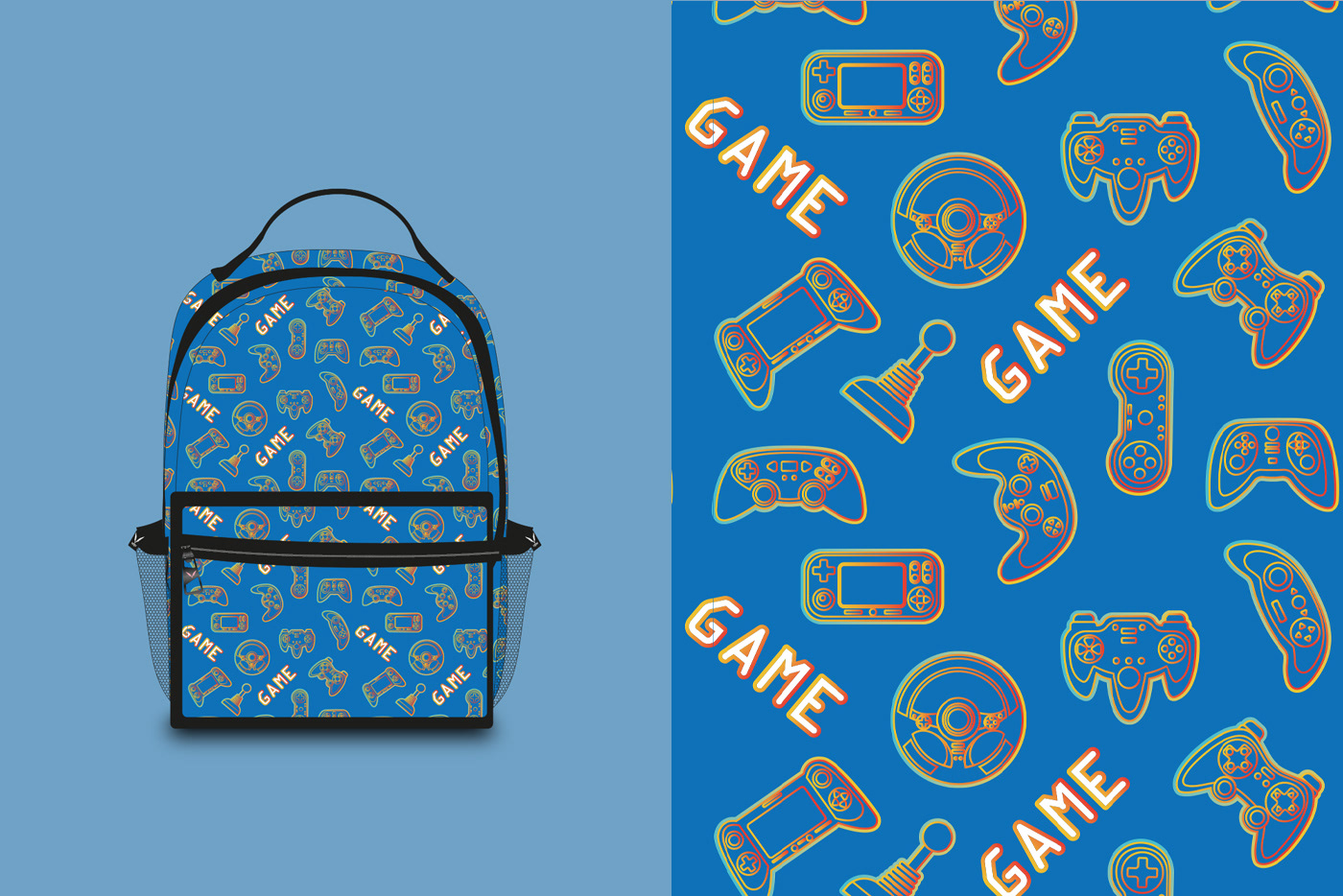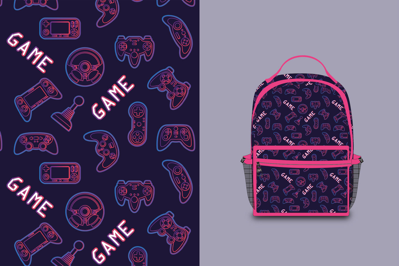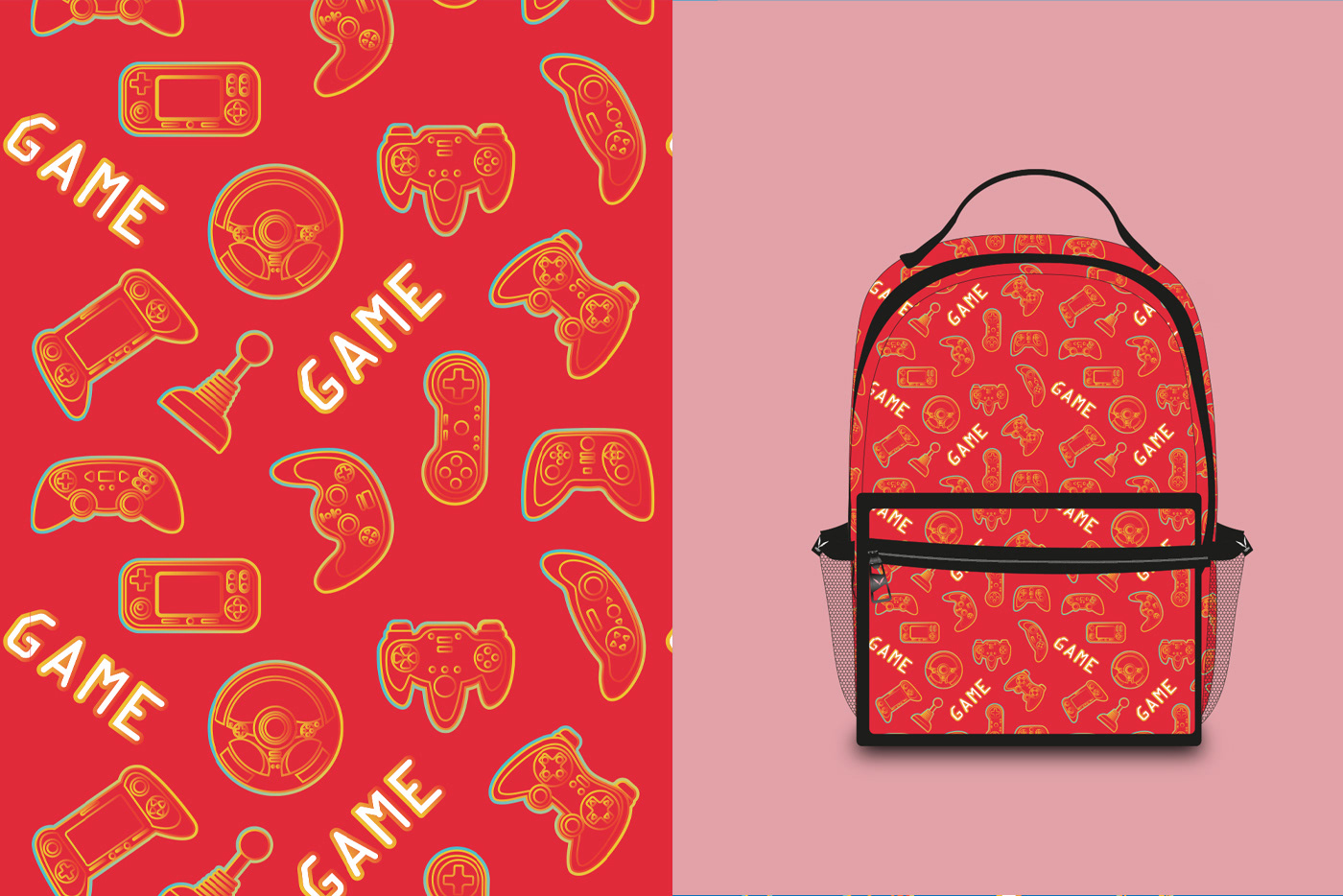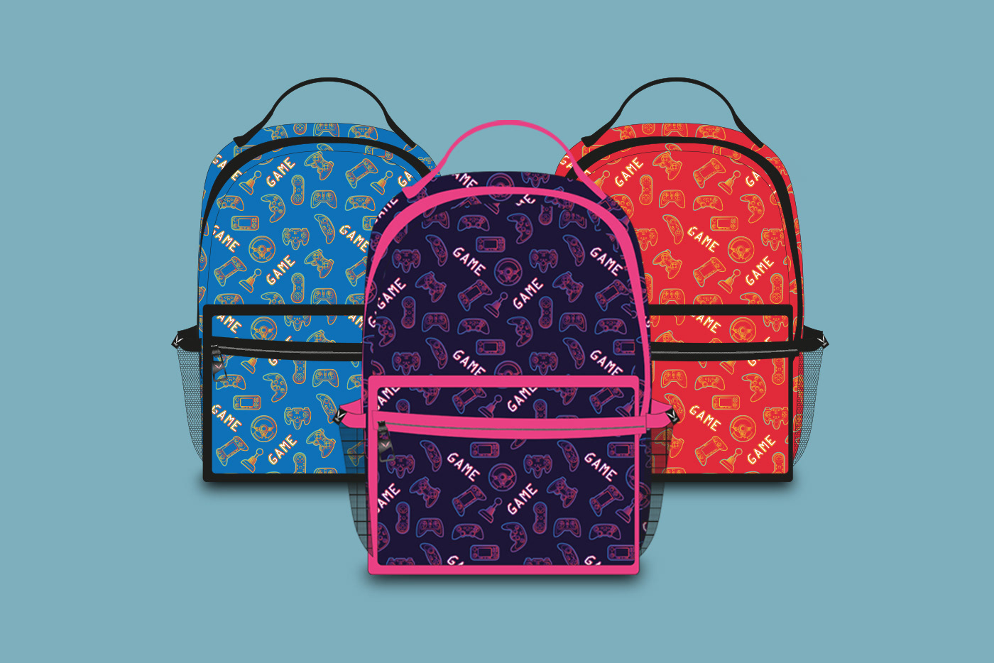 Illustrations and pattern design for backpacks. 3 models. Developed for a local brand in Rio de Janeiro. "Gamer" product line for young people.